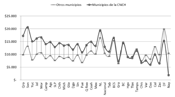 Al realizar un comparativo por entidades federativas del ingreso corriente promedio por hogar, en municipios dentro y fuera de la primera etapa de la CNCH, se observa que en la mayoría de las entidades el ingreso es mayor en los municipios que son parte de la población objetivo que en el resto, lo cual podría explicarse porque en la mayoría de los municipios seleccionados predomina la población urbana, lo cual eleva el ingreso promedio (Figura 5).