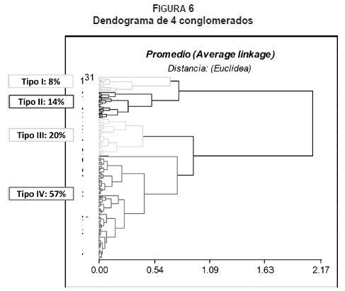 A partir de este componente, se formaron cuatro conglomerados, cuya estructura y distancia queda reflejada en el dendograma (Figura 6). Se observa que el conglomerado con distancia más próxima a cero, es decir con observaciones más cercanas entre sí, es el Tipo iii; por su parte, el conglomerado con observaciones más distantes es el Tipo iv, lo que indica mayor heterogeneidad.