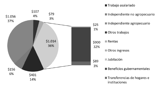 El primer conglomerado se caracteriza porque el ingreso de los hogares depende prácticamente de dos fuentes y en una proporción muy similar: el trabajo independiente agropecuario y los beneficios provenientes de programas gubernamentales, que sin contemplar la estimación del gasto imputado por alquiler significan 37% y 32% respectivamente (Figura 7).