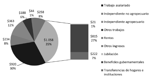 Aún más evidente que las localidades rurales, son los hogares que dependen altamente del ingreso no laboral, pues las transferencias representan el 28% del ingreso corriente total, siendo de 15% la aportación del rubro de beneficios por programas gubernamentales.