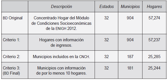 Para seleccionar y analizar las variables de interés desde la dimensión de ingresos de los hogares, se tomó la información del Módulo de Condiciones Socioeconómicas de la Encuesta Nacional de Ingresos y Gastos en los Hogares (MCS-ENIGH 2012), elaborado por el Instituto Nacional de Estadística y Geografía (INEGI , 2014). El MCS-ENIGH 2012 se levantó durante el periodo del 27 de agosto al 21 de noviembre de 2012 y presenta resultados a nivel nacional, con corte urbano y rural para cada una de las entidades federativas. Se tomó la base de datos “Concentrado Hogar”, que en su totalidad proporciona información de 57,274 hogares. Para seleccionar la base de datos definitiva, se tomaron los criterios que se muestran en el Cuadro 1, quedando finalmente un total de 25,244 hogares, en los que se cuenta con información de cada una de las entidades federativas del país.