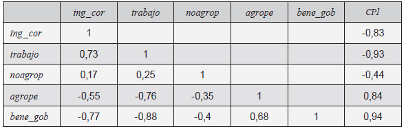 Ahora bien, el rubro de ingresos por negocios no agropecuarios se correlaciona positivamente con el ingreso corriente, pero en un nivel bajo; y esta variable en menor medida explica el primer componente principal. Sin embargo, la aplicación de componentes principales permite que las cinco variables originales estudiadas queden resumidas en un índice (primer componente principal), que explica el 67% de la variabilidad total, lo cual se considera aceptable (Cuadro 3).