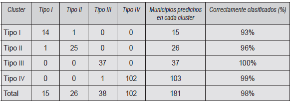 Para evaluar la clasificación obtenida, se utilizó el análisis discriminante, ya que éste permite identificar cuántas observaciones están asignadas correctamente. En el Cuadro 4 se observa que el 98% de los municipios quedaron correctamente clasificados, el 2% restante corresponde a tres municipios que el análisis discriminante coloca en el conglomerado más cercano.