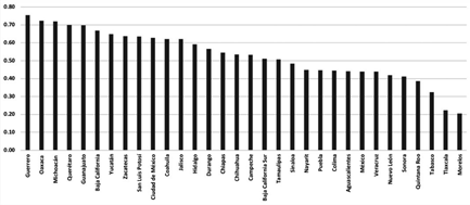 El gráfico previo muestra el resultado del índice sobre la representación política de las mujeres en los Congresos sub nacionales en México para el periodo 2018. Después de haber considerado el porcentaje de curules femeninas, las presidencias de mujeres de las comisiones legislativas relevantes, la presidencia femenina del órgano rector y las coordinaciones de mujeres de los grupos parlamentarios, podemos observar que cinco entidades alcanzaron un valor igual o superior a 0.70 (Guanajuato, Guerrero, Michoacán, Oaxaca y Querétaro); 14 Legislaturas consiguieron valores en un rango de 0.51 a 0.67; 11 Congresos obtuvieron valores en un rango de 0.32 a 0.48; ysólo dos entidades (Tlaxcala y Morelos) obtuvieron valores de 0.22 y 0.20,respectivamente.