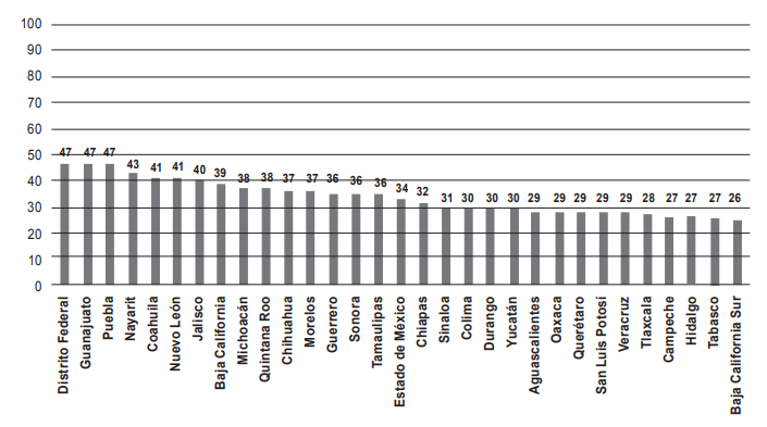 Una legislatura requiere contar con suficientes recursos económicos para desempeñar sus funciones con eficacia, de lo contrario no podrá contar con legisladores profesionales, servicios de apoyo y asesoría o condiciones de trabajo adecuadas. Esta variable es muy difícil de operacionalizar, porque deseablemente se debería medir si un sistema de comisiones cuenta con recursos y cómo lo ejerce, así se podría evaluar si el destino de los recursos abona a su institucionalización. Sin embargo, los resultados de la observación de las pruebas piloto confirman que la ausencia de información legislativa y del uso de recursos económicos hacen prácticamente imposible saber cómo ejercen los recursos las legislaturas locales. Como resultado de la operacionalización del concepto, es el único indicador que no observa específicamente al sistema de comisiones, sino al presupuesto de la legislatura, por ser el único dato disponible vía remota. Se otorga el valor de la unidad cuando el presupuesto asignado al Poder Legislativo representa al menos el 2% del total del presupuesto estatal asignado en el año fiscal vigente. Quizá es la más frágil de las mediciones y observaciones, ya que se puede argumentar que el monto de recursos disponible no necesariamente significa que los mismos son ejercidos con precisión y efectos directos en la actividad legislativa de las comisiones, o que no se cometen desvíos. Sin embargo, es el único dato disponible que nos permite tener una idea cercana del monto de recursos que emplea una legislatura para su actividad interna, del que debemos suponer sólo una parte es dedicada al trabajo en comisiones. Se calcula sobre una base del 2% debido a que un porcentaje mayor del presupuesto pondría en entredicho el principio de separación de poderes, ya que otorgaría al Legislativo la posibilidad de influir mediante el gasto público en los programas gubernamentales más allá de su tarea de autorizar y supervisar el gasto. Se emplea dicho porcentaje de referencia, pues se encuentra en el rango promedio de las asignaciones presupuestarias a legislaturas democráticas. La variable dependiente transparencia, como se aclaró previamente, se refiere al desempeño de los órganos públicos respecto del acceso y disponibilidad de la información que generan, administran o utilizan, como parte de sus responsabilidades públicas. En el caso de los sistemas de comisiones de legislaturas subnacionales, la observación de este tipo de variables tiene diversos obstáculos precisamente por la ausencia de información. En 2015, la Alianza para el Parlamento Abierto que agrupa a organizaciones de la sociedad civil que promueven una agenda en materia de acceso a la información, presentó un reporte donde se destacaba que ninguna legislatura local del país cumplía con al menos el 50% de los indicadores que midieron en su modelo, como se muestra en el siguiente gráfico. Solamente la Cámara de Senadores apenas superó con un 52% ese umbral.5