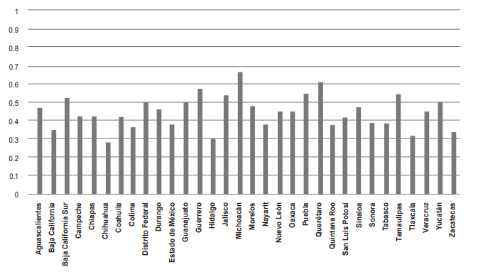 La gráfica anterior muestra el resultado del grado de institucionalización de los congresos locales en México, y de acuerdo con el modelo de evaluación, se puede observar que el nivel de institucionalidad de sus sistemas de comisiones es relativamente bajo, pues sólo unas pocas entidades logran rebasar el valor de 0.5 (Baja California Sur, Guerrero, Jalisco, Michoacán, Puebla, Querétaro y Tamaulipas). Cuán determinante es el desarrollo de capacidades institucionales de las comisiones en el desempeño general de la legislatura en diversos ámbitos como la transparencia, es algo que deberá explorarse en estudios posteriores. Este trabajo ha propuesto una metodología y los primeros hallazgos de carácter comparado en la materia, y se espera ampliar la investigación para dotarle de capacidad explicativa a las variables que buscan identificar el problema estudiado.