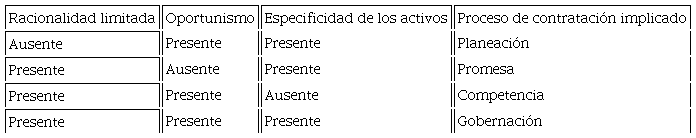 Derivado de la situación expuesta anteriormente, en la cual se explicó la relación de la especificidad de los activos con la tendencia a integrar estos en una sola estructura empresarial y por tanto fomentar la concentración en el mercado, una de las alternativas que se ha planteado es la desconcentración de las actividades productivas por medio de contratos que permitan una participación uniforme de los competidores en el mercado. Así, un contrato está inmerso en un sistema donde, como lo explica Williamson (1989: 40), están implicados puntos como la planeación, una promesa, la competencia y la gobernación (estructura u orden al interior de las firmas). Para determinar la efectividad o no de aquel, es necesario relacionar los siguientes puntos que magistralmente Williamson conjuga: la racionalidad limitada,11 el oportunismo12 y la especificidad de los activos.