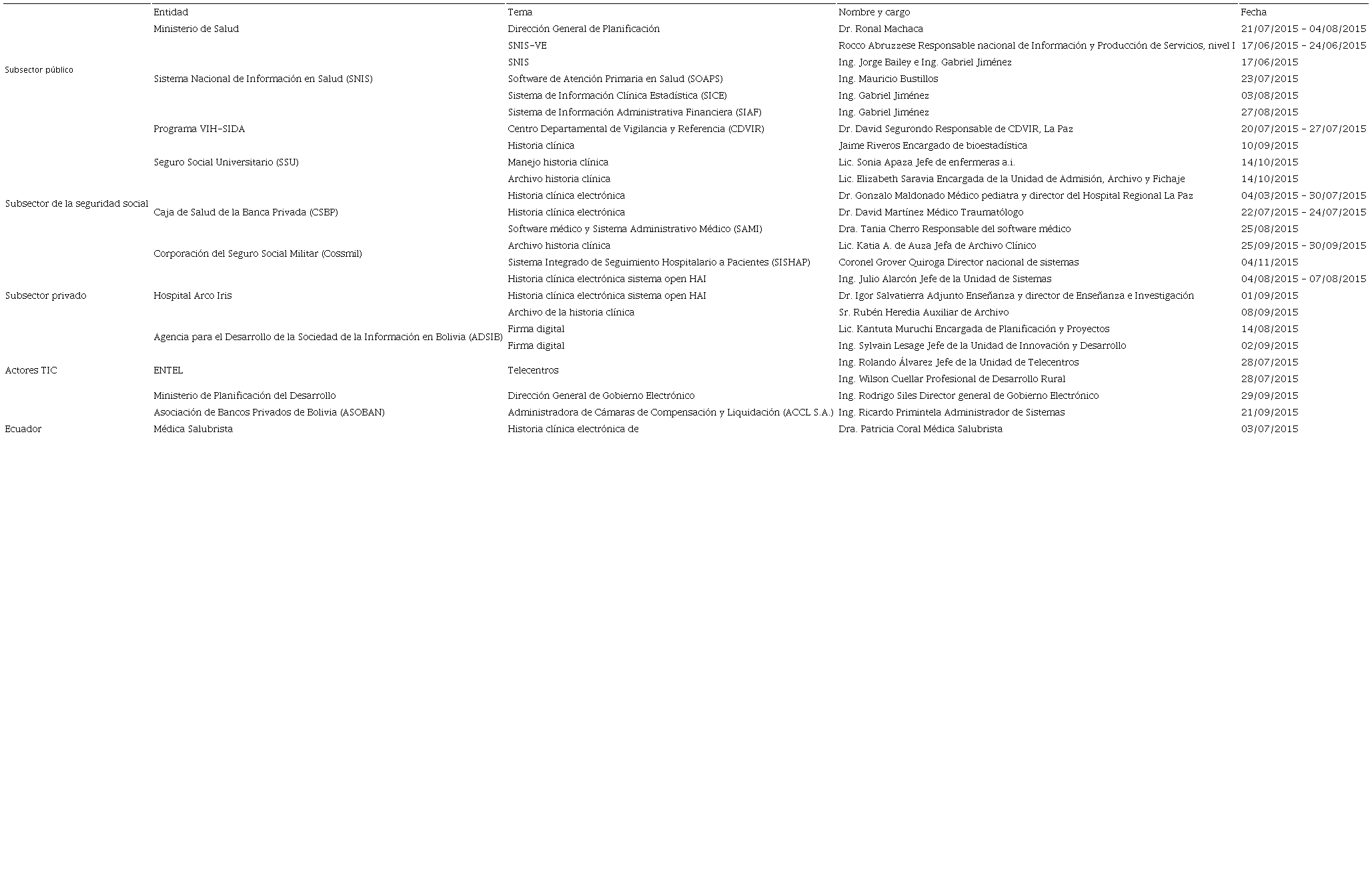 Las cuestiones más interesantes, resultantes de estas entrevistas en la materia que nos ocupa, aparecen reflejadas en las líneas siguientes y en las conclusiones del presente documento. Cabe mencionar que no se incluyen todas por el espacio que representaría; sin embargo, se ha recogido en la tabla que figura a continuación el total de actores claves que aportaron información, la materia sobre la que versan y las fechas de éstas para crear una visión panorámica del ámbito sanitario en Bolivia, de manera general, y en la ciudad de La Paz, de manera particular.