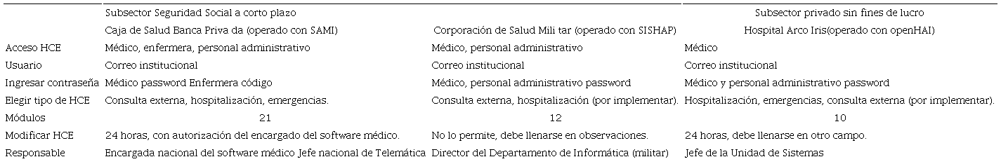 En el subsector público destacan: la Dirección General de Planificación del Ministerio de Salud y el Sistema Nacional de Información en Salud (SNIS); en el subsector de seguridad social, el Seguro Social Universitario (SSU), la Caja de Salud de la Banca Privada (CSBP) y la Corporación del Seguro Social Militar (COSSMIL), estas dos últimas están implementando la historia clínica electrónica en consulta externa y hospitalización. En el subsector privado se ha considerado al Hospital Arco Iris, establecimiento de salud sin fines de lucro, que también ha implementado la historia clínica electrónica en hospitalización desde hace dos años.