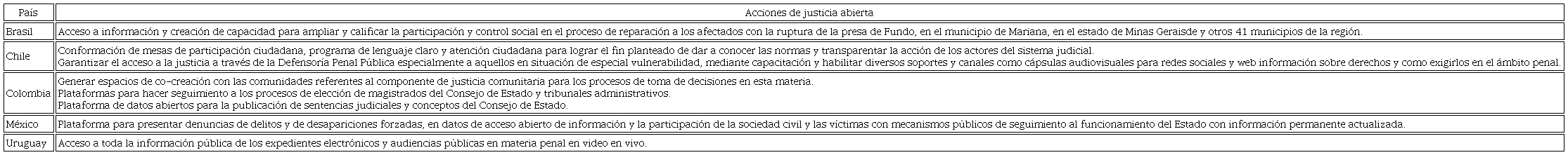 La imagen de probidad del Poder Judicial es fundamental en sociedades democráticas pues refuerza valores como la moralidad, honradez e integridad para administrar justicia en relación con ciudadanos como funcionarios públicos. Algunas de las acciones sugeridas por el CLAD de justicia abierta son “generar mecanismos de seguimiento de procesos en cada instancia judicial a través del uso de TIC; promover la transparencia en la selección de jueces; contar con expedientes públicos de calificación, evaluación y sanción de jueces” (2016, 18). Ahora, al revisar las acciones propuestas por los cinco países en estudio los hallazgos son los siguientes: