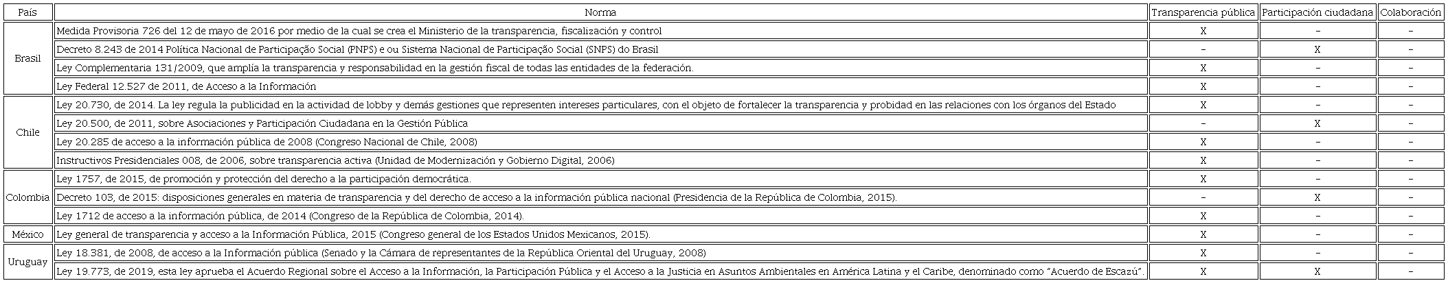 Dar cumplimiento a los compromisos asumidos en los plan de acción de GA lleva implícito el desarrollo o fortalecimiento de un marco normativo transversales, por ello, en este documento se mencionarán las normas que textualmente en su encabezado hace referencia a los ejes de transparencia pública-acceso a la información, participación y colaboración en cada uno de los cinco países en estudio, y señalando en la Tabla 1 con una X el eje al cual aportan.