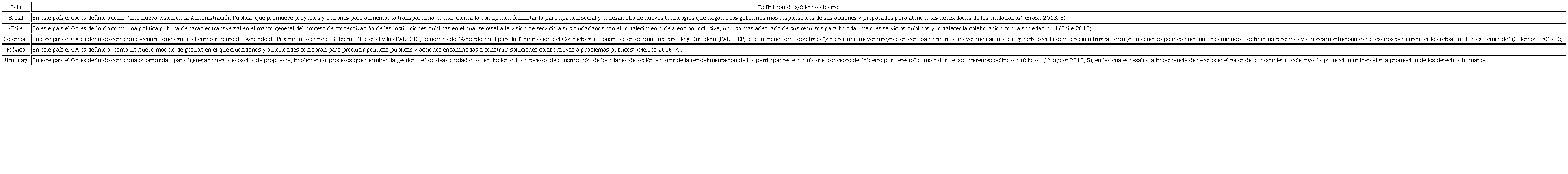 Que mejor escenario para dar muestra de un compromiso estable y duradero con los retos que plantea el GA que la misma construcción de los planes de acción, estos son resultado de un ejercicio de participación con diferentes actores de la sociedad, mediante la realización de talleres, mesas de discusión, grupos focales, comisiones de estudio, entre otros. El resultado, un documento que plasma la forma única que cada país reconoce su realidad y proyecta sus compromisos entre el gobierno y la sociedad. Así entonces, el primer aspecto a comparar sobre los planes de acción es en relación a la definición de GA propuesta por cada uno de los países en estudio, la cual se presenta en la Tabla 2.