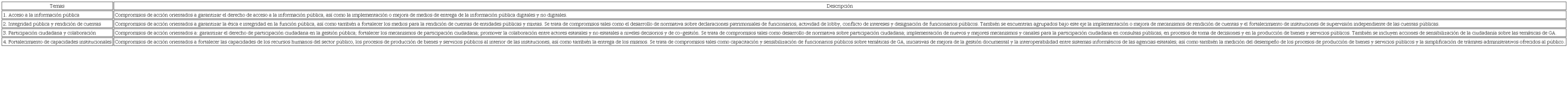 Complementario a lo anterior, se presenta en la Tabla 4 la versión de los planes de acción de GA que se encuentran en ejecución, el número de compromisos asumidos y su distribución en los cuatro temas propuestos por el Observatorio Regional de Planificación para el Desarrollo de América Latina y el Caribe.