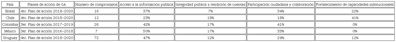 Desde 2011, con la conformación de la Alianza para el Gobierno Abierto (AGA) los países integrantes de esta iniciativa multilateral aceptaron cumplir con cuatro compromisos: el primero, consiste en suscribir y aprobar a nivel nacional la declaración de principios de GA; el segundo, proponer planes de acción con vigencia de dos o tres años para el desarrollo del GA, en el presente documento este es el instrumento seleccionado para dar inicio al estudio comparado entre Brasil, Colombia, Chile, México y Uruguay; el tercer compromiso, consiste en someterse a los informes de evaluación con la finalidad de verificar el cumplimiento de metas, y finalmente, el cuarto compromiso es contribuir a la promoción del GA en otros países.