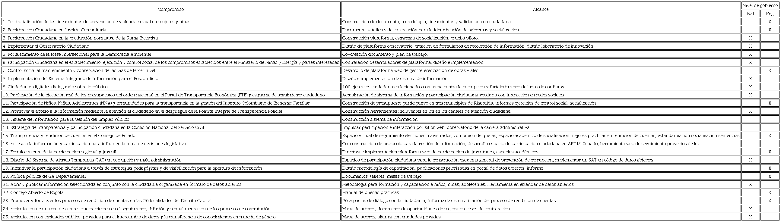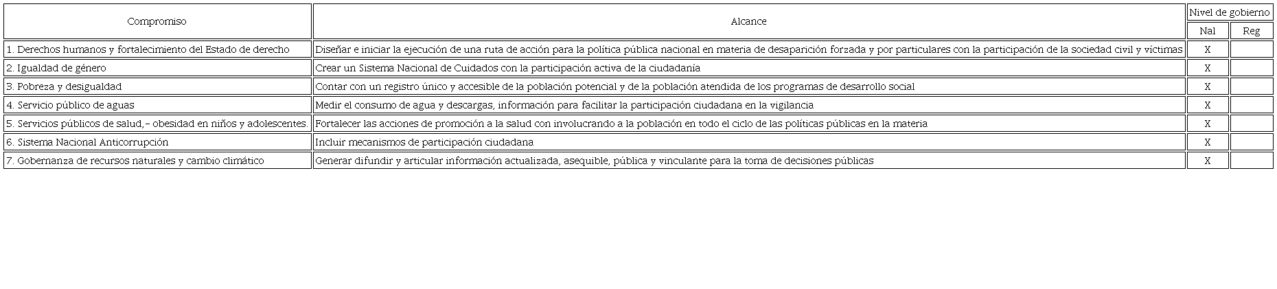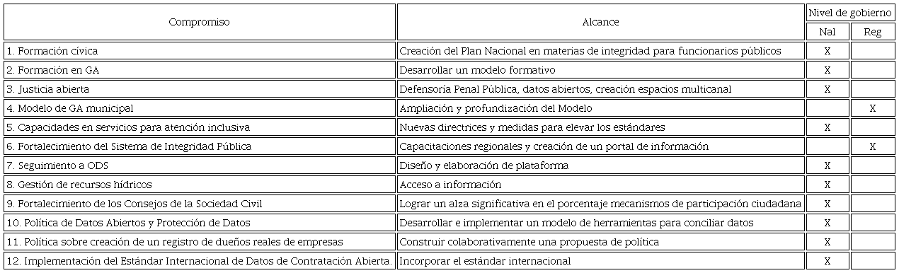 Una visión más detallada requiere identificar los compromisos específicos de los cinco países. A continuación se presentan una descripción de los planes de acción, cual es el alcance de cada compromiso y cual el nivel de gobierno (nacional o regional) al cual apunta señalándolo con una X.