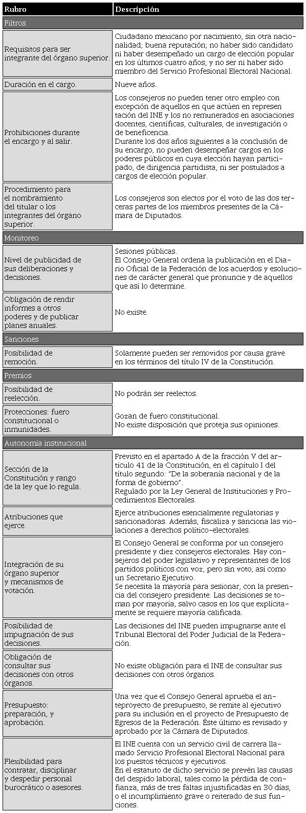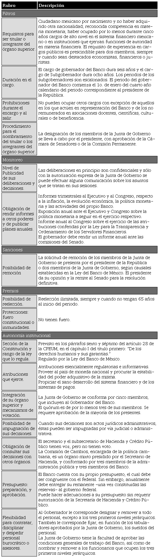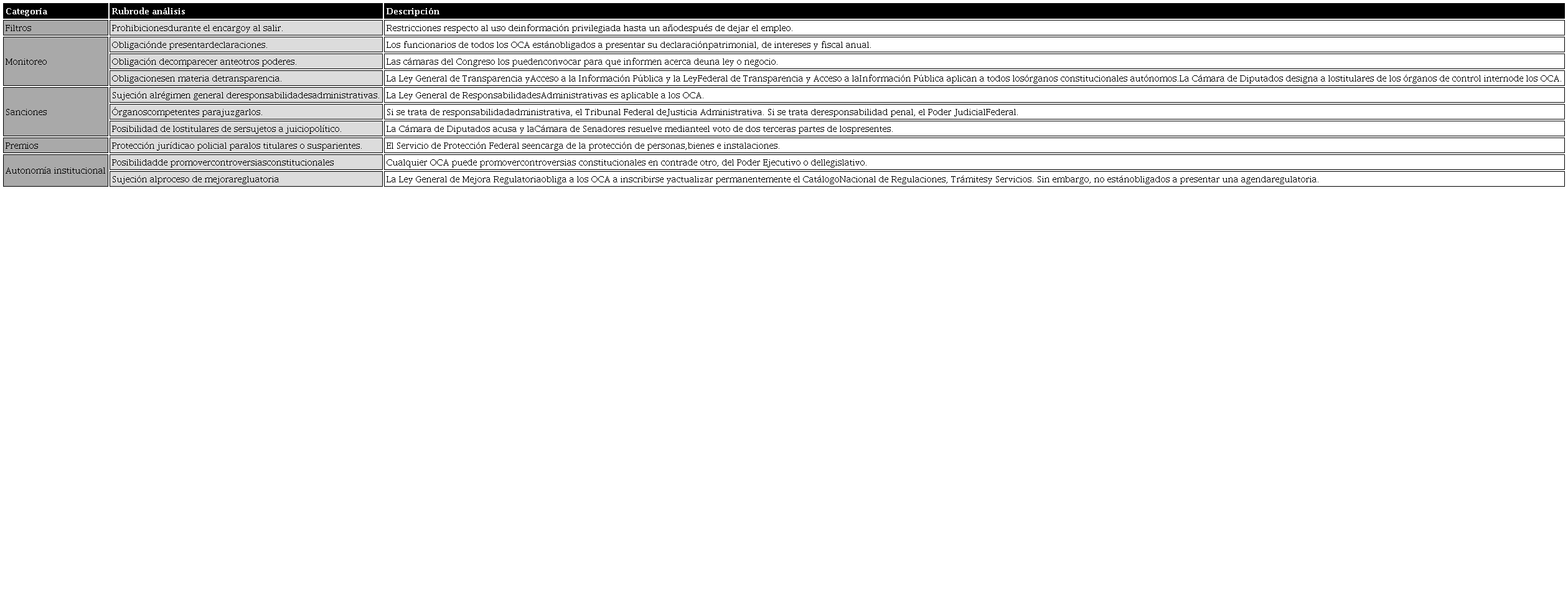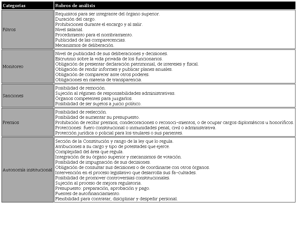 Lo anterior se logra resolviendo los problemas de selección adversa y riesgo moral que caracterizan a toda relación agente-principal, lo que implica: crear filtros para seleccionar a los titulares de los organismos autónomos; establecer mecanismos de monitoreo para observar y fiscalizar su comportamiento; e implementar un sistema de premios y castigos para incentivar o desincentivar los comportamientos deseados. A estas categorías, en este estudio se agrega otra denominada autonomía institucional, en la que se captura la capacidad que tiene un organismo para autogobernarse, así como la disponibilidad de remedios judiciales para protegerse de invasiones a sus competencias. En la tabla 1, se resumen estas cinco categorías y se proporcionan ejemplos de los aspectos estudiados respecto a cada una de ellas.