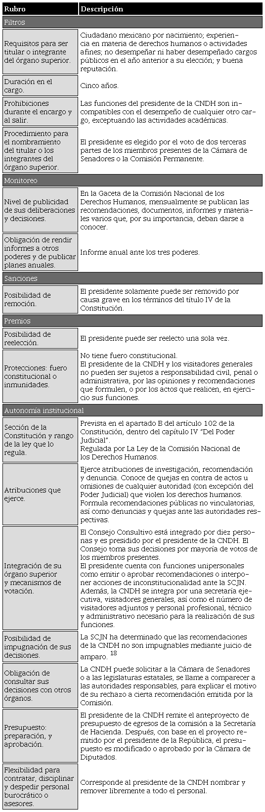 El contraste de estos tres organismos revela con claridad elementos relevantes del régimen diferenciado en cada una de las cinco categorías. Dentro de los filtros, el requisito de pericia técnica -principal fundamento para distanciarlos de los poderes clásicos-, no es estricto. Quizás con el objetivo de ciudadanizar al órgano electoral, no existe requisito de estudios o experiencia para ser consejero. Esta falta de filtro puede matizarse por el Comité Técnico que evalúa a los candidatos a consejeros (CPEUM, art. 41, apartado V, inciso a). Para Banxico, si bien no hay requisitos formales de estudios para formar parte de la Junta de Gobierno, los aspirantes deben contar con reconocida competencia en materia monetaria y haber ocupado un cargo de autoridad financiera por cinco años; de este último requisito puede eximírsele a dos miembros. Finalmente, para ser presidente de la CNDH se requiere experiencia en materia de derechos humanos; ésta podría ser, por ejemplo, haber sido activista. Entonces, de los tres mecanismos de filtros, los más demandantes son los del Banxico.