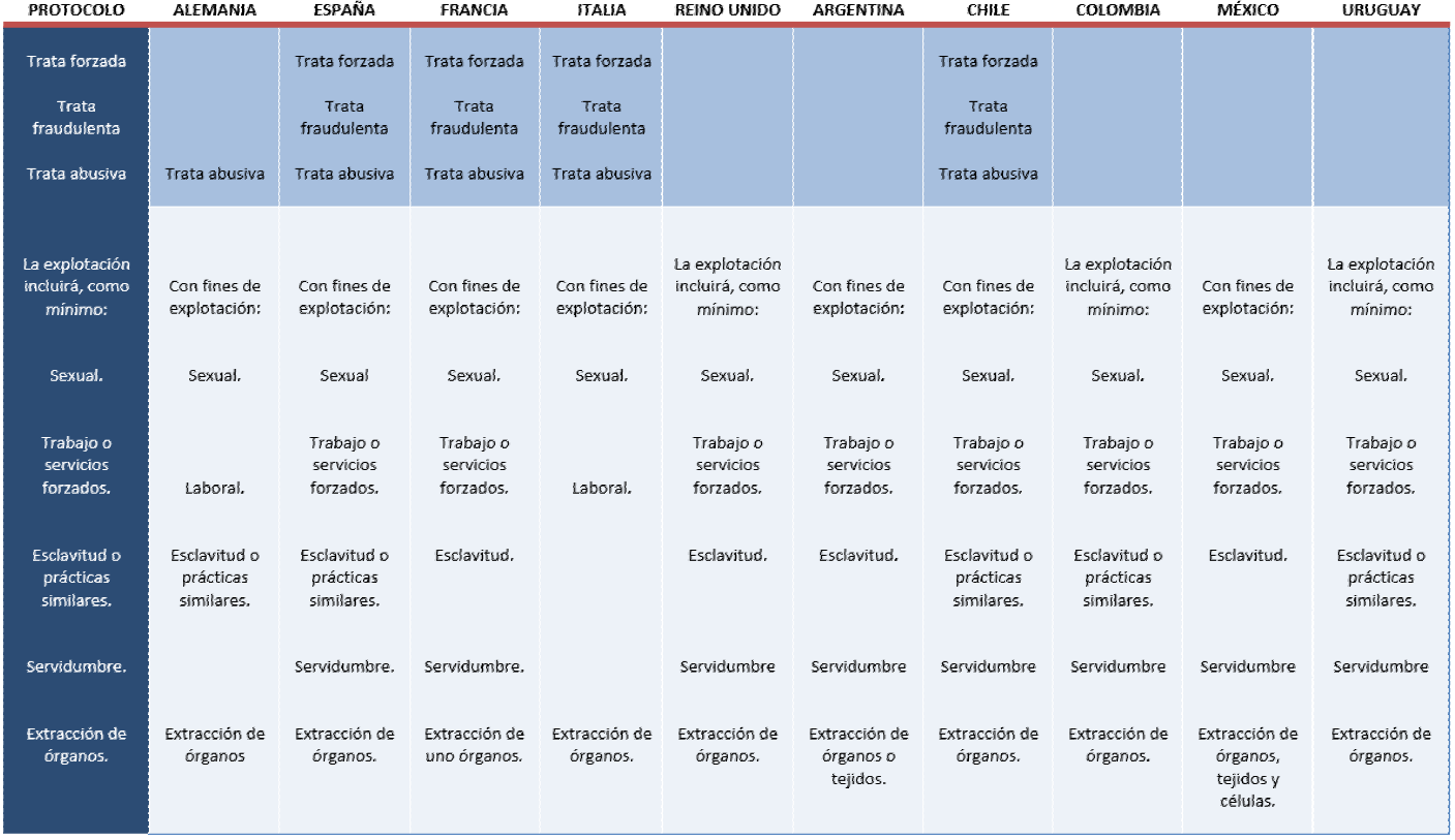 Precisamente por esta razón sorprende que, a pesar de las recientes reformas, la mayoría de las normas nacionales no exijan para la aplicación del tipo básico de trata de personas el empleo de medios violentos, intimidatorios o abusivos, tal y como se demanda en el instrumento normativo internacional. En este sentido, cabe diferenciar dos grupos de países. El primero estaría conformado por los que definen el tipo básico únicamente por la realización de alguna de las conductas características del proceso de trata de personas con fines de explotación, por lo que no resulta necesaria la concurrencia de ningún medio de doblegación de la voluntad de la víctima (Reino Unido, Argentina, Colombia, Uruguay y México) o, a lo sumo, como sucede en Alemania, sólo contemplan la situación abusiva, mientras que la violencia y la intimidación se prevén en un tipo autónomo. Y el segundo grupo estaría compuesto por los países que, por el contrario, tal y como exige la normativa internacional en este ámbito, sí definen la trata de personas jurídico-penalmente con base en sus tres elementos característicos: la acción, el medio de determinación de la voluntad de la víctima y la finalidad de explotación (España, Francia, Italia y Chile).
