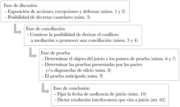 El artículo 61 enumera varios puntos sobre los cuales se debe desarrollar la audiencia preliminar que culminan, en el parágrafo siguiente, con la resolución que cita a las partes a juicio, donde quedan fijados todos los aspectos tratados con anterioridad. En esta audiencia de preparación existe una sucesión escalonada de actos. No se podría recibir la causa a prueba si el juez no hubiera llamado primeramente a conciliación. Si las partes llegan a acuerdo, todo lo anterior sería inútil. Tampoco es coherente llevar el conflicto a mediación y luego otorgar la oportunidad a una de las partes para que oponga la excepción de incompetencia, y así sucesivamente.