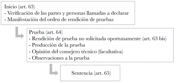 Para coordinar el progreso de la etapa probatoria el legislador concede, al inicio, la oportunidad para que sean las partes quienes expresen el orden en que van a rendir sus pruebas, comenzando con la prueba del demandante y finalizando con la del juez. Es interesante destacar que son ellas entonces las que, mediante esta habilitación legal, fijan el instante preclusivo. Este período culminará con las observaciones que demandante y demandado hagan a la prueba rendida y a la opinión del consejero técnico, si ésta fue solicitada por el juez.