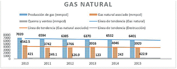El volumen de gas natural no aprovechado en las actividades de exploración y extracción a nivel nacional en 2016 fue en promedio de 503.8 mmpcd, cifra superior a cualquiera de los años anteriores desde que se empezó a regular la quema y el venteo en 2009 (CNH 2010, 2). Pero, si lo miramos con mayor detenimiento, es lógico encontrarnos con ese volumen de gas no aprovechado, debido a que desde 2015 se venían mostrando cifras similares.