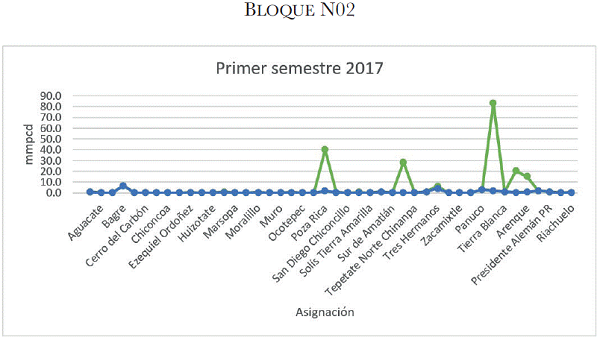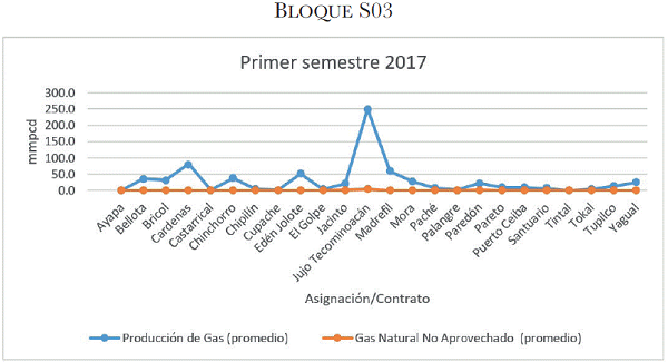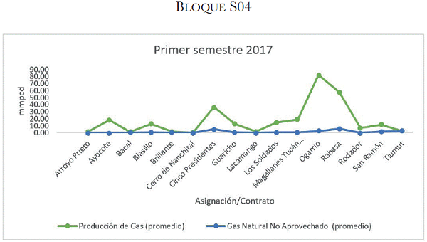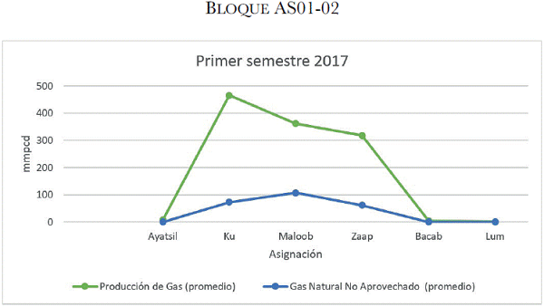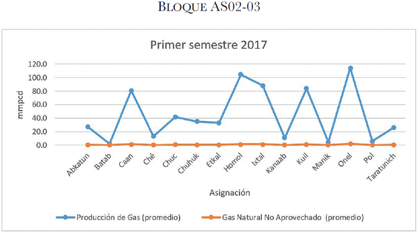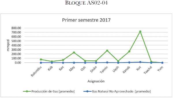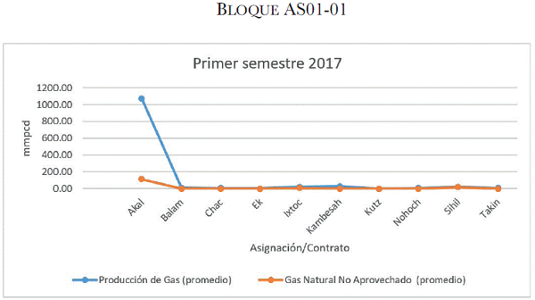 Se puede observar en el primer semestre de 2017 que, dentro del bloque AS01-01 (Cantarell), la producción de gas se dio principalmente en el campo Akal, con una producción que rondaba en promedio los 1100 mmpcd, mientras que en las demás asignaciones y contratos las producciones se mantuvieron en promedio por debajo de los 30 mmpcd.
