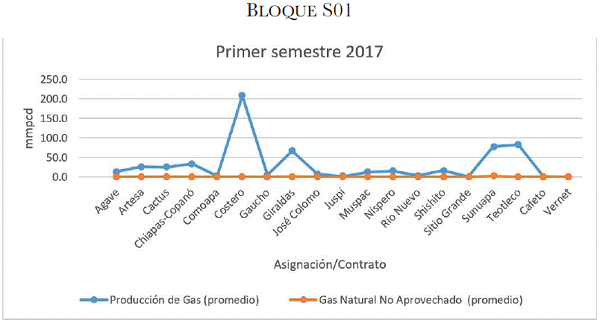 En el bloque S01 (Macuspana Muspac), se puede observar que la producción de gas se da fundamentalmente en cuatro áreas que son: Costero, Giraldas, Sunuapa y Teotleco, quienes manejan volúmenes bajos de gas natural no aprovechado comparados con sus volúmenes de producción, es un bloque con porcentajes muy positivos de aprovechamiento de gas, pues solo tres de las 17 asignaciones y contratos aún no habían alcanzado la meta del 98%, como se muestra en la siguiente tabla: