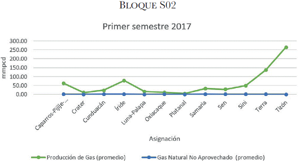 En el gráfico se muestra el bloque S02 (Samaria Luna) y se observa que maneja volúmenes importantes de producción, en donde el área con el mayor volumen promedio de producción es la de Tizón, la que le sigue es Terra y de ahí continúa con Íride y así sucesivamente hasta llegar al campo Platanal, también se pueden observar volúmenes bajos de gas natural no aprovechado, lo que contribuye a generar porcentajes altos de aprovechamiento, como se muestra en la siguiente tabla: