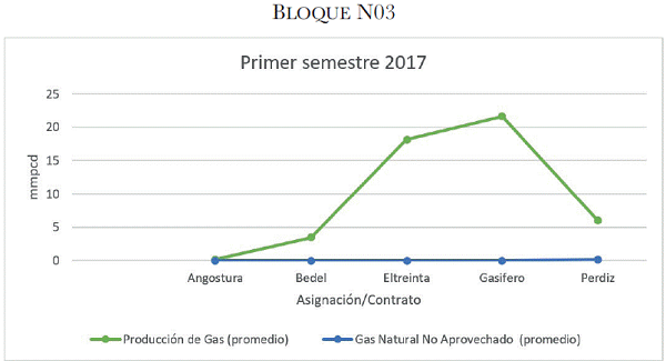 A continuación, se presentan gráficos de cada uno de los bloques en donde se muestra la producción promedio y el volumen de gas no aprovechado del primer semestre de 2017.