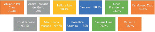 Encontrando desde el campo Yum con el volumen de producción más bajo del bloque de 1.67 mmpcd y con un volumen de gas no aprovechado de 0.17 mmpcd, hasta el campo Xux con el volumen de producción más alto de 720 mmpcd y un volumen de gas no aprovechado de 11 mmpcd, dando como resultado los porcentajes mostrados en la tabla siguiente: