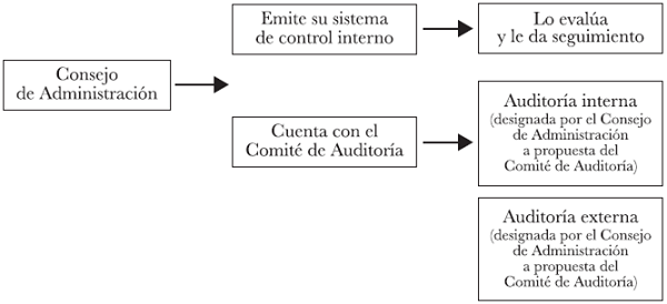 La Ley establece que el Consejo de Administración tendrá la facultad de emitir, a propuesta del Comité de Auditoría, los lineamientos de control interno. También señala que el mismo Consejo tendrá a su cargo la evaluación y seguimiento del control interno, esta función también la desempeña la auditoría.