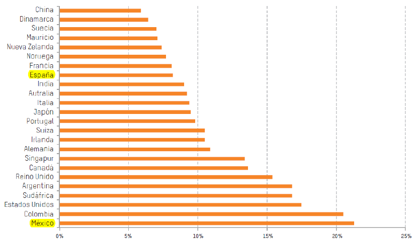 La gráfica anterior representa el porcentaje del ingreso total que le corresponde al 1% de la población de mayores ingresos. Las cifras revelan que México es el país de la muestra en donde al 1% más rico le corresponde un mayor porcentaje del ingreso total (21%), siendo el país con mayor desigualdad de distribución de la riqueza. Por lo contrario, en España el porcentaje aproximado es del 8% por lo que la desigualdad es notoriamente inferior.27