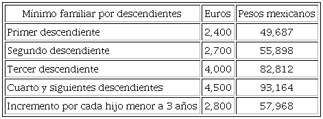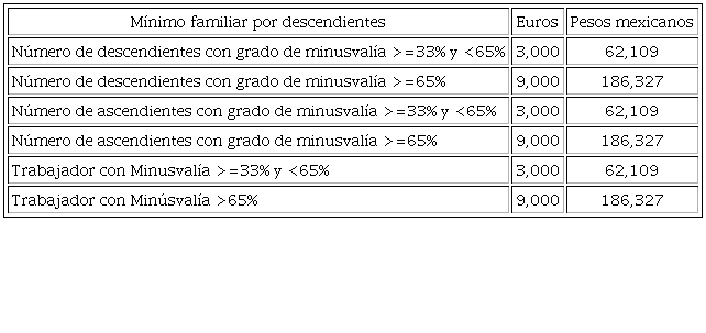El mínimo personal para todas las personas físicas es de 5,500 euros al año (aproximadamente 114,902 pesos mexicanos), estipulado en el artículo 57 de la LIRPF.