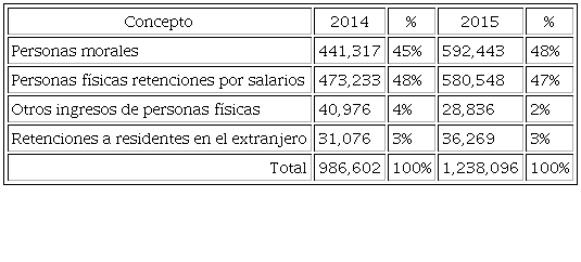 En el recuadro anterior puede identificarse que el rubro de retenciones por salarios de las personas físicas aporta de forma muy significativa a la recaudación de impuesto sobre la renta (ISR) en nuestro país. En el 2014 representó el 48% de la recaudación del ISR e incluso los asalariados pagaron más impuesto que las personas morales. En el ejercicio 2015 representó el 47% del ISR. Estas cifras nos dan una idea de la importancia que tiene la contribución de los asalariados en nuestro país.