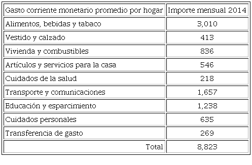 Por otro lado, el mismo instituto en su Encuesta Nacional de Ingresos y Gastos en los Hogares efectuada (ENIGH) en el 2014, determina que el ingreso monetario promedio mensual de un hogar es de 10,534 pesos y el gasto monetario corriente es de 8,823 pesos el cual se integra principalmente de los siguientes rubros: