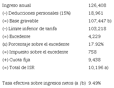 Si calculamos nuevamente la tasa efectiva, pero en lugar de restar las deducciones personales de la LISR utilizamos los gastos promedios anualizados que realmente tendría que pagar un asalariado de clase media con base en el ENIGH se obtendría lo siguiente: