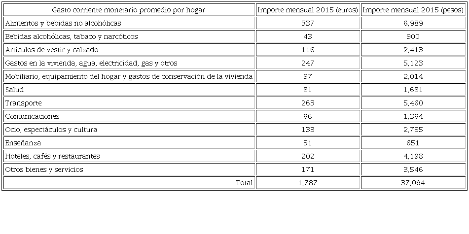 Por otro lado, de acuerdo con el INE, el gasto promedio por hogar es de 1,787 euros mensuales, esto es aproximadamente 37,094 pesos mexicanos mensuales, y se conforma normalmente de las siguientes partidas: