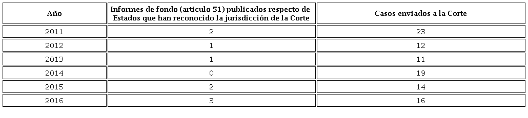 Si se revisa la evolución en el número de casos remitidos a la Corte como proporción de los casos decididos por la Comisión (respecto de aquellos Estados que han reconocido la jurisdicción de aquélla), se advierte, sin embargo, que no se ha producido un descenso al respecto luego de la reforma reglamentaria, que entró en vigor en agosto de 2013. Véase en este sentido el cuadro siguiente: