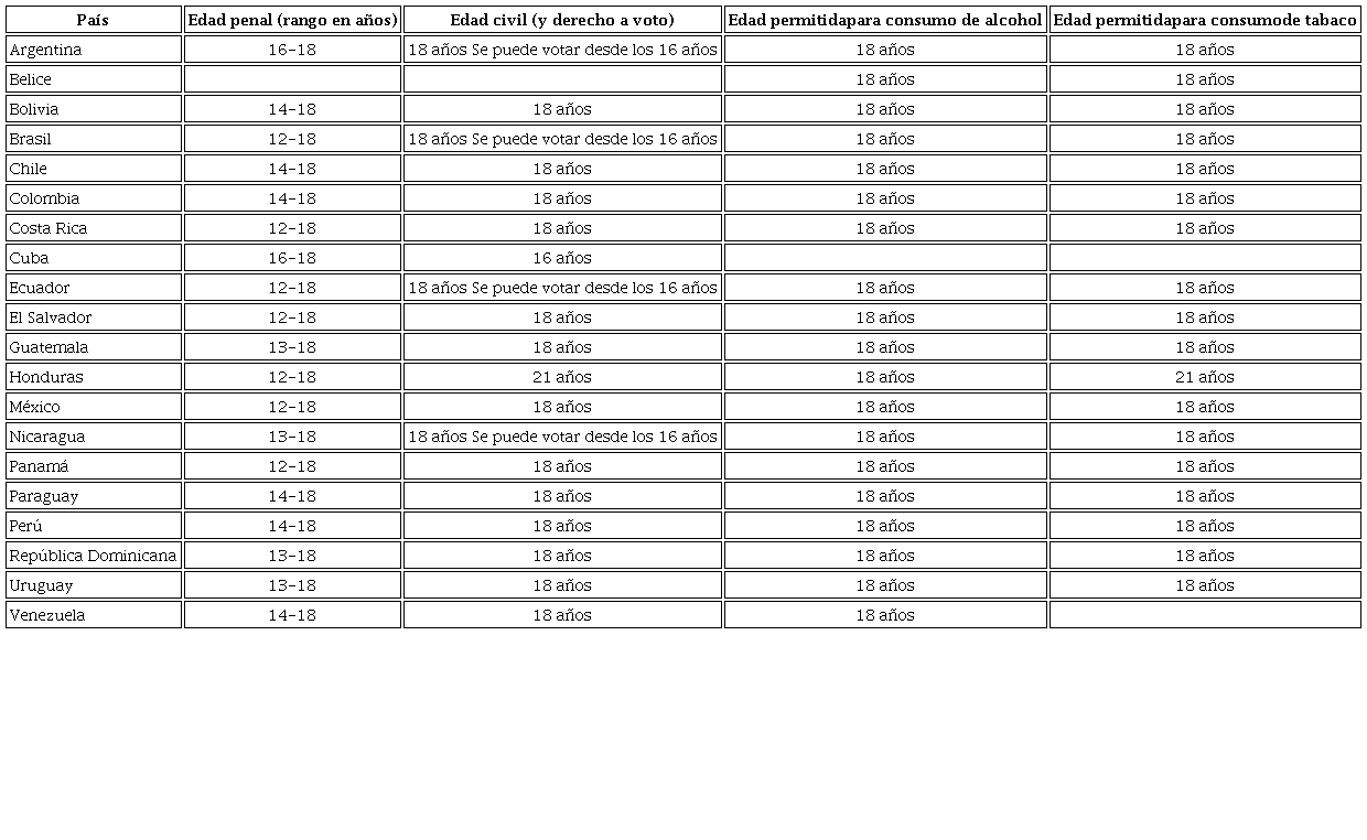 FUENTE: Elaboración propia con base en los datos contenidos en Sedletzki, Vanessa (2016). Las edades mínimas legales y la realización de los derechos de los y las adolescentes. Una revisión de la situación en América Latina y el Caribe. UNICEF, pp. 53-56. Respecto a los datos de la mayoría de edad y edad para votar, se han revisado los códigos civiles vigentes de cada país. Para los datos de edad mínima para el consumo de alcohol se ha consultado ICAP (2012). Edad mínima legal para adquirir y consumir alcohol en el mundo. International Center for Alcohol Policcies. Para el consumo de tabaco se revisaron las normativas específicas para cada país.