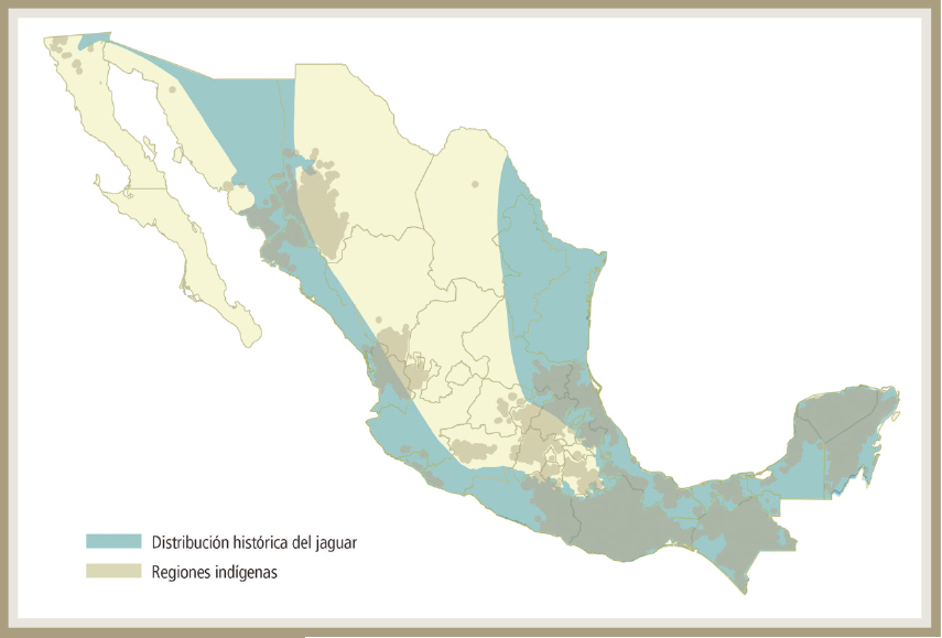 México es un país con una gran diversidad biológica y cultural. El mosaico étnico que en la actualidad subsiste se puede apreciar desde la pluralidad lingüística de los descendientes de los grupos prehispánicos, ya que la gama cultural registra once familias lingüísticas, 68 agrupaciones lingüísticas y 364 variantes lingüísticas.3 De acuerdo con la Encuesta Intercensal 2015, el 21.5% de la población en México se considera indígena de acuerdo con su cultura, historia y tradiciones; 1.6% se considera parte indígena, y 74.7% no se reconoce como indígena; sin embargo, sólo 6.5% de la población de tres años y más habla alguna lengua indígena.4 Los grupos étnicos comúnmente se encuentran asentados en zonas con alta biodiversidad, emparentándose con la distribución del jaguar (imagen 1), lo que ha tenido como resultado una relación única y milenaria con esta especie.