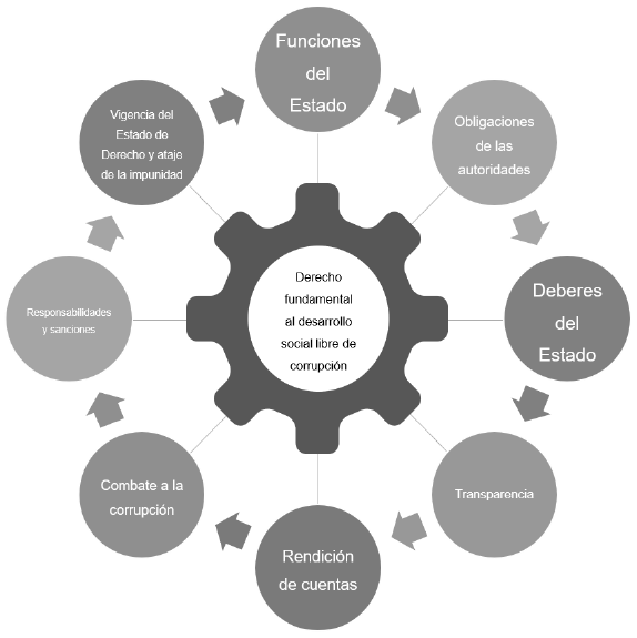 En el caso del derecho fundamental al desarrollo social libre de corrupción, como construcción epistemológica, es el nexo causal de dos extremos. En el primero de ellos se encuentran las funciones del Estado para que los individuos se desarrollen plenamente en los aspectos personales (vida e integridad física y psíquica de la persona, la libertad y la seguridad) y políticos (derechos de los ciudadanos a participar en la vida pública); a que cuenten con un adecuado nivel de vida (derechos económicos, sociales y culturales); así como a gozar de los derechos difusos o supraindividuales, derechos de los pueblos, solidarios o colectivos de la humanidad (a la paz, a un medio ambiente sano, al desarrollo); las cuales se encuentran concatenadas a la obligación de todas las autoridades de promover, respetar, proteger y garantizar los derechos humanos de conformidad con los principios de universalidad, interdependencia, indivisibilidad y progresividad, y el consecuente deber del Estado para prevenir, investigar, sancionar y reparar las violaciones a los derechos humanos.