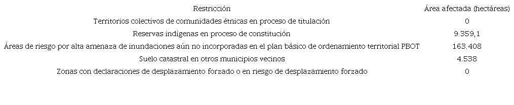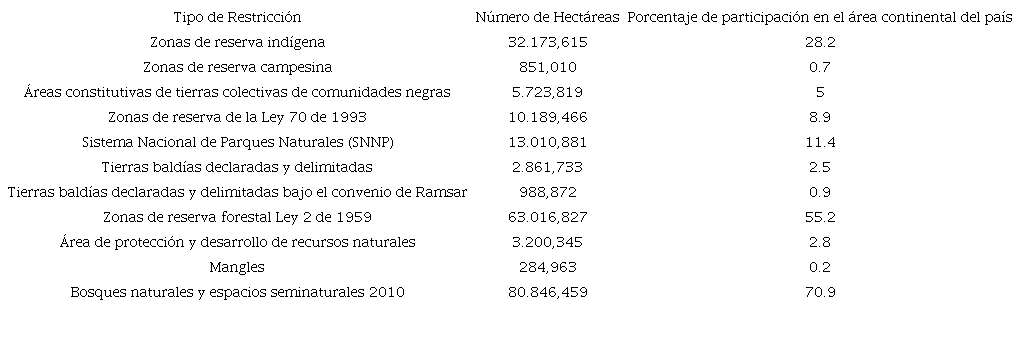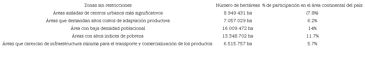 La Tabla 1 muestra el tipo de restricción para la constitución de Zidres teniendo en cuenta los aspectos legales, y la Tabla 2, territorios sin restricciones.
