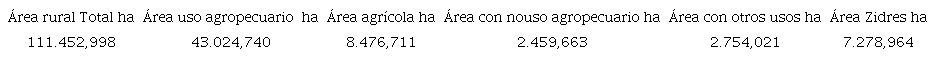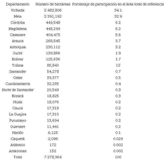 La delimitación de las Zidres corresponde al gobierno nacional a través de la Dirección Nacional de Planeación, que haciendo un cruce con los territorios que deben ser exentos de esta destinación han identificado en el país un total de 7.278,964 hectáreas, que equivale al 6.4% de total nacional (Departamento Nacional de Planeación [DNP], 2018). Vistas desde un modo global, se podría afirmar que la incidencia de las Zidres no es significativa, pero aterrizadas en el contexto, corresponde a una extensión casi equivalente al uso agrícola total de la tierra en Colombia. En la Tabla 3 que se muestra a continuación se presentan las cifras de las hectáreas disponibles por su uso por departamento en Colombia; en la Tabla 4 según el uso general de la tierra.