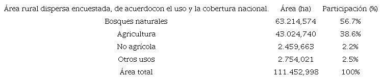 De acuerdo con el Censo Nacional Agropecuario (DANE, 2016), Colombia cuenta con una extensión territorial de 114.074,970 hectáreas, de las cuales 111.452,998 ha. corresponden al área rural, el 56.7% de éstas, son de bosques naturales, el 38.6%, de uso agropecuario, el 2.2% de uso no agropecuario y el 2.5% es tierra de otros usos. Estas cifras dan cuenta de la importancia del “campo” para el desarrollo nacional, la mayor parte de la extensión territorial es rural, que, por la concentración inequitativa de la tierra y la violencia por el conflicto armado, se han constituido en zonas con alta vulnerabilidad económica y social.