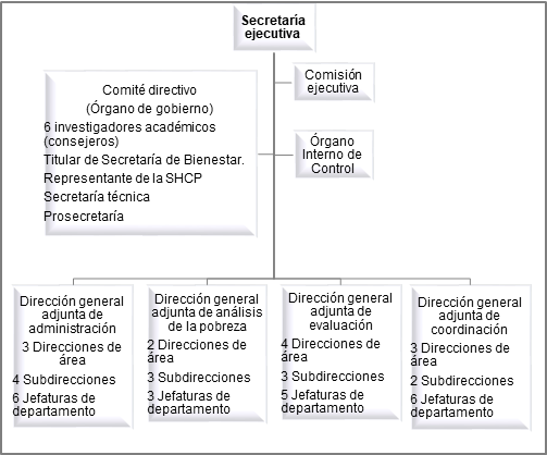 La estructura del Consejo8 (Figura 1) está conformada por el Comité directivo, Comisión ejecutiva, Secretaría ejecutiva, unidades administrativas y Órgano Interno de Control (OIC). El Comité directivo u Órgano de gobierno está integrado por seis investigadores académicos (consejeros), la(el) titular de la Secretaría de Bienestar, un representante de la SHCP, una Secretaría técnica y una Prosecretaria. La(el) titular de la Secretaría ejecutiva permanece cinco años pudiendo ser reelectos por un periodo igual (CPEUM, artículo 26).