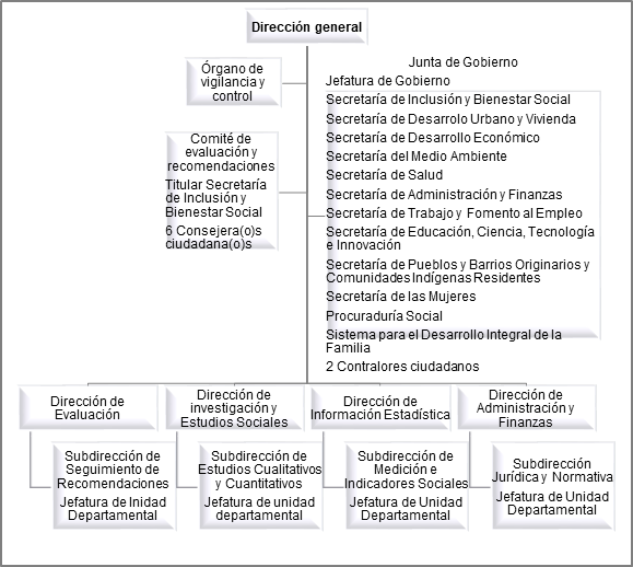 Estaba integrado por una Junta de Gobierno (jefa/e de Gobierno, titulares de diez secretarías, dos entidades y dos contralores ciudadanos), la Dirección general y el Comité de evaluación y recomendaciones, constituido por la Secretaría de Inclusión y Bienestar Social y seis consejera(o)s ciudadana(o)s (ver Figura 2).11 Estos últimos operaban como órgano colegiado designados por la(el) jefa(e) de Gobierno de forma irrevocable e inamovibles por cuatro años, pudiendo ser reelectos por un periodo igual para garantizar autonomía, independencia, libertad de criterio e imparcialidad en la toma de decisiones.