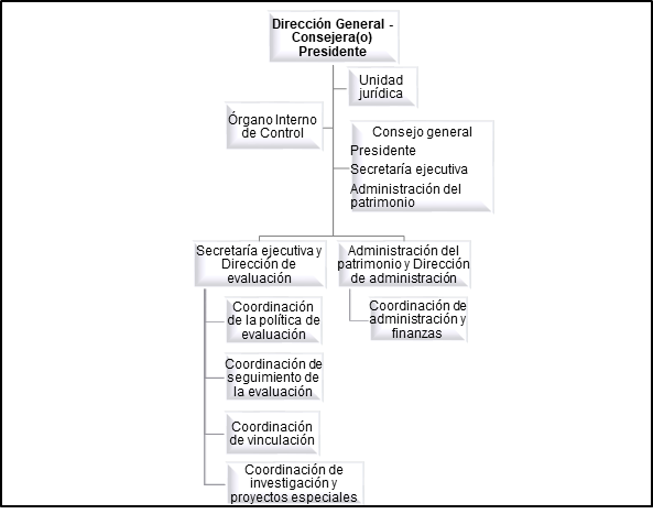 Para realizar sus actividades, el Instituto cuenta con un Consejo General, conformado por tres consejeras(o)s propietaria(o)s: i) Consejería presidente-Dirección General, ii) Consejería Secretaría Ejecutiva-Dirección de Evaluación, y iii) Consejería, Administración del Patrimonio-Dirección de Administración (véase Figura 3). Estarán cinco años en su encargo, y pueden ser reelectos por un periodo igual; sesionarán por lo menos seis veces al año de manera ordinaria y cuando sea necesario de manera extraordinaria.