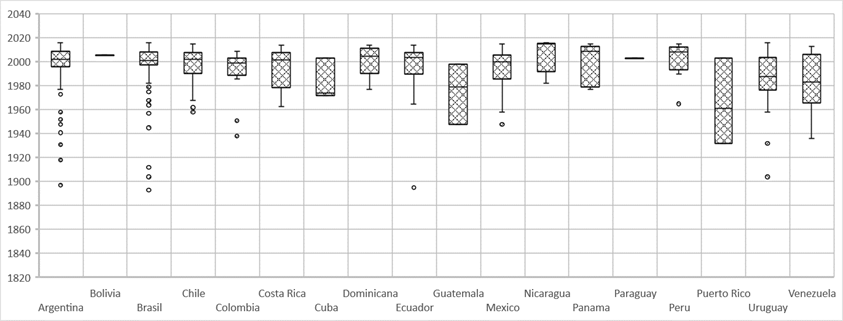 La ilustración I representa el número de revistas incluidas en la muestra por país de publicación y año de fundación para las que fue posible localizarlo (N=734). Dentro de las que aparecen representadas se encuentran algunas publicaciones, como la Revista da Faculdade de Direito, Universidade de Sâo Paulo, fundadas hacia finales del siglo XIX (1893), así como algunas bastante recientes, como Trabajo y Derechos Humanos, Universidad de Buenos Aires, Facultad de Ciencias Sociales, fundada en 2016. Asimismo, destaca que el año promedio de fundación de las revistas incluidas en la muestra sea 1997. De hecho, que en la década de los noventa se reporte la fundación de la generalidad de las revistas analizadas parece indicar que a pesar de la permanencia que ha tenido este campo no logró institucionalizarse plenamente en la región hasta casi un siglo después de haberse fundado la primera revista del universo analizado.