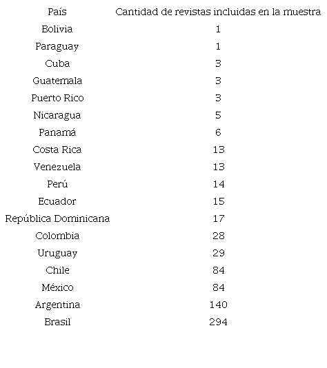 Dada la escasa producción de trabajos sobre el tema, no se cuenta con información que permita contrastar el grado de representatividad de la muestra. Pero algo que sí podemos describir es la forma en que se distribuyen las 753 revistas a lo largo de los dieciocho países incluidos en la muestra. Por país, la cantidad promedio de revistas jurídicas incluidas es de 41.8 (Min. 1/Max. 294; Desv. Est. 207). Los países que mayor cantidad de revistas representan en la muestra son: Brasil (294), Argentina (140), Chile (84), México (84). Los países que menos revistas aportan en la muestra son Bolivia y Paraguay, con una observación por país. La tabla siguiente sintetiza la distribución de revistas por país incluidos en la muestra.