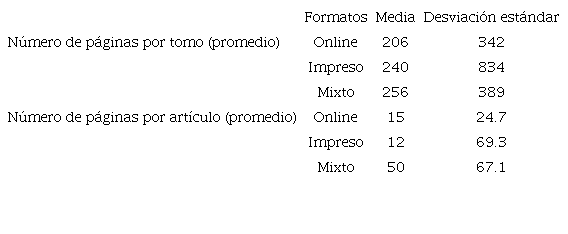 La hegemonía y tradición que tiene la publicación impresa de revistas jurídicas sobre los formatos digitales parece corresponderse y encontrar sintonía con el activo papel que ha jugado la expresión escrita de las ideas jurídicas en la conformación cultural de los sistemas legales latinoamericanos. Se trata, quizás de uno de los rasgos más distintivos del pasado colonial de la región que ni los cambios culturales que han sido impulsados durante los últimos años, ni tampoco el andamiaje e influjo del sistema anglosajón frente al romano-germánico, han logrado subvertir.7 Pero aun en este contexto, es posible distinguir varias diferencias importantes. Por mencionar algunas: las revistas jurídicas que se publican en formatos mixtos (digitales e impresos) suelen ser aquellas que publican artículos y tomos con una mayor cantidad de páginas; en igual sentido, las revistas que se publican en formato impreso son las que presentan una menor uniformidad en cuanto al número de páginas que suelen publicar, al menos a juzgar por los valores de la desviación estándar [Tabla 2].